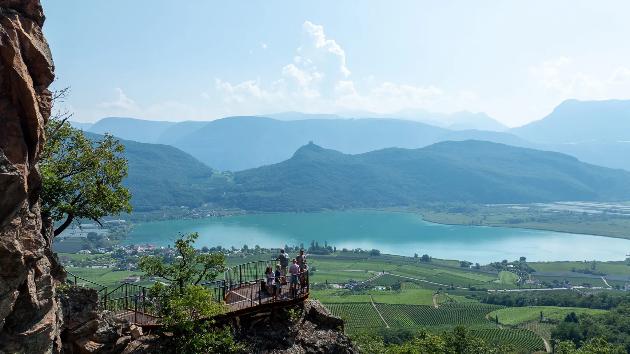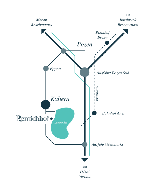 Ausfahrt „Bozen Süd“, nach der Mautstelle links halten zur Auffahrt auf die Schnellstraße Richtung Meran, erste Ausfahrt „Eppan“, rechts abbiegen zur „Weinstraße“ und auf dieser bis zum Kalterer See.